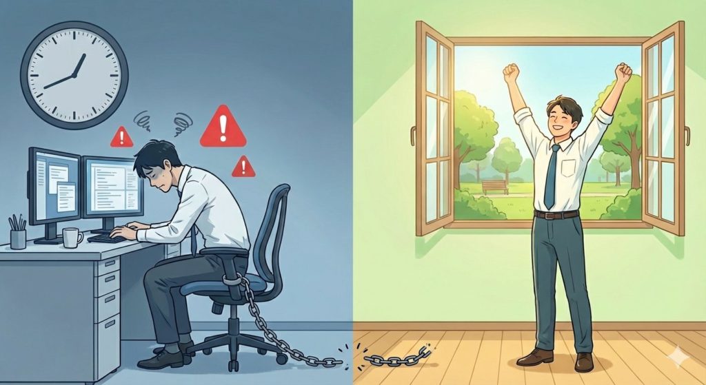 The virtue of “staying at your desk”: An atmosphere where diligently remaining seated is often seen as a sign of “working hard.”